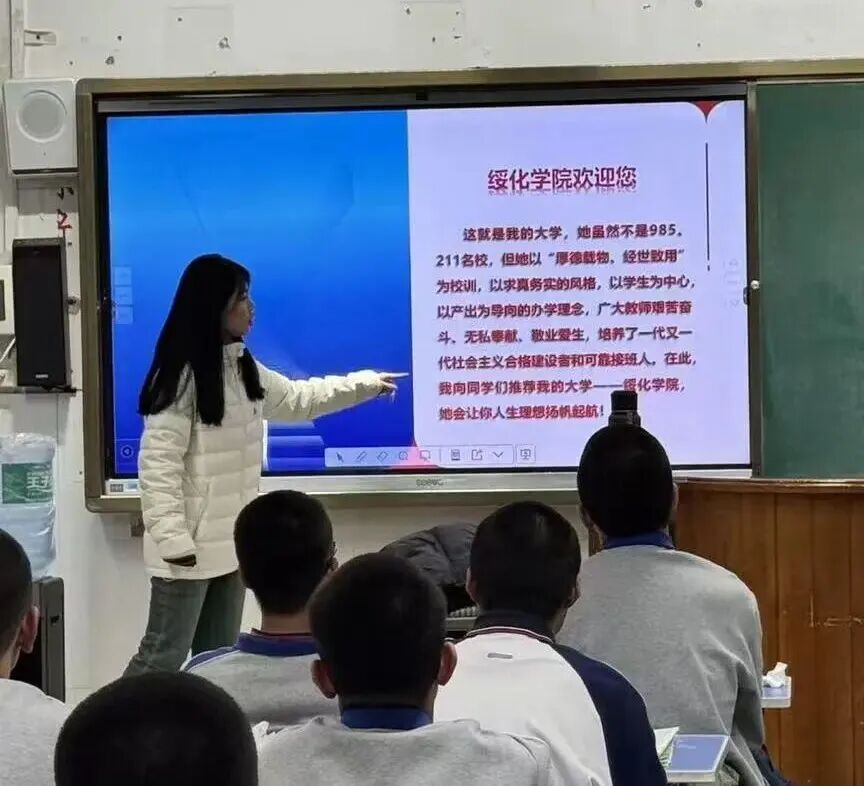 1月3日,于海璐同学回到了梦想起航的地方——“龙江县第二中学”开展宣讲活动。站在熟悉的教室里,她向学弟学妹展示了她眼中的绥院,从图书馆的灯火、实验室的身影到运动场上的活力,丰富的校园生活让学弟学妹们直观领略到大学生活的独特魅力,也加深了大家对绥化学院的认知。随后,她以亲身经历介绍大学专业与社团生活,并分享高中学习方法与心态调整经验。互动环节中,她耐心解答学弟学妹的疑问。活动的最后,她说:“从他们眼里,我看见了曾经那个憧憬又不安的自己。”