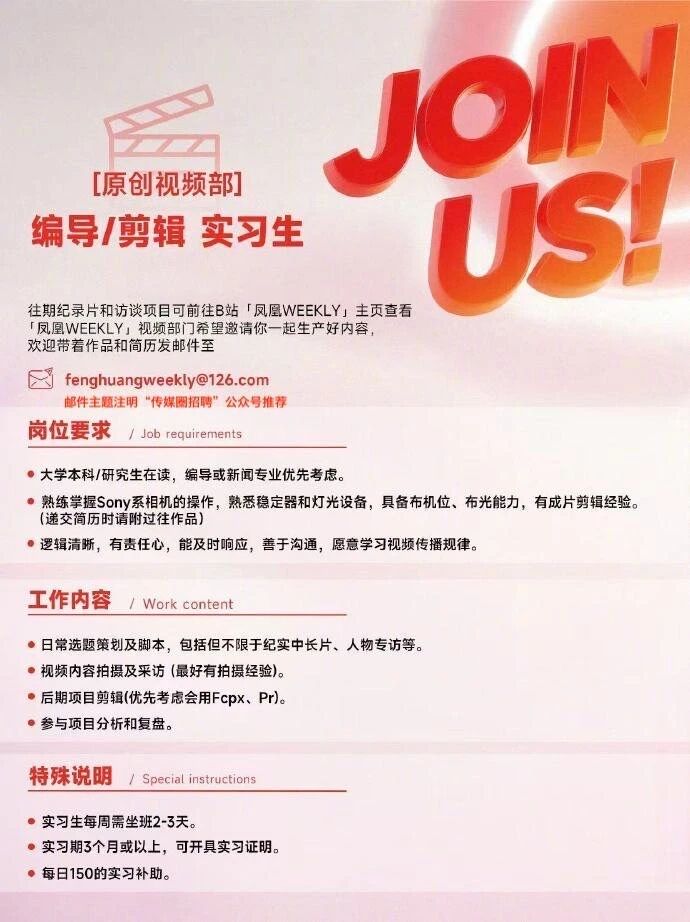 就业指导丨凤凰周刊原创视频部招聘编导/剪辑/实习生!
