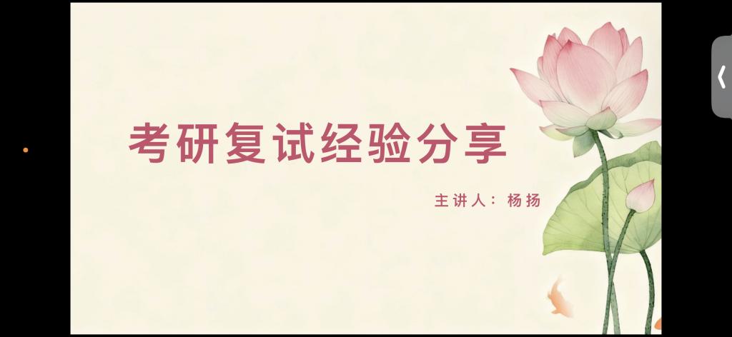 分享环节,两位主讲人结合实战经验倾授复试秘籍。刘文涛学姐聚焦礼仪形象与面试问题应对两大核心分享经验,从自我介绍准备到预设问题应答再到学术素养提升,干货密集、针对性极强,同时叮嘱同学们注重谈吐礼仪,放平心态,从容应对临场随机提问。杨洋学姐则从备考规划,复试流程,心态调适,互动答疑四方面拆解应试技巧,梳理全流程备考细节,破解常见误区,耐心解答学子疑问。鞠亚林老师在总结时指出,科学的备考计划与积极的心态是复试成功的关键,并鼓励考生主动联系嘉宾进行后续交流。